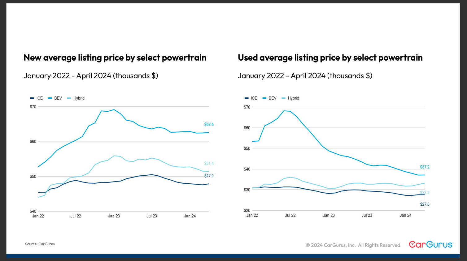 EVs are becoming more affordable, with the average listing price of new EVs dropping 5% YoY in April, marking the eighth consecutive month of decline. Used EV prices have also fallen significantly, decreasing 19% YoY for the 17th consecutive month. The price gap between used gas vehicles and fully electric vehicles has shrunk by 74% since June 2022. Among the top ten used vehicles with the largest price drops in April 2024, all but one were EVs, with prices falling between 30% and 38% YoY. Additionally, the availability of used EVs has increased, and many are now eligible for the used EV tax credit, with 36% of all EV listings priced under $25,000 (up from 18% the previous year). As prices have decreased, interest in used EVs has surged, with views on CarGurus up 36% YoY in the first quarter of 2024.